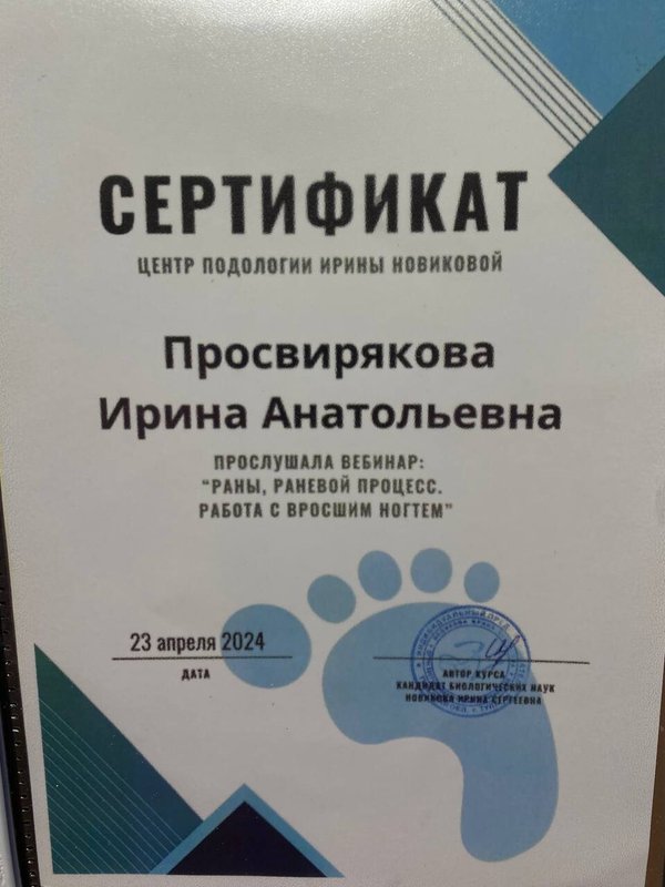 Многократно обращался в кабинет, всегда получал отличный результат. Посещаю Ирину Анатольевну Просвирякову — она прекрасный доктор, заботливый и внимательный к деталям. Она всегда всё объясняет и предупреждает о всех мелочах. Приходил на педикюр и обработку стопы — всё выполнено на высшем уровне. Очень доволен услугами!