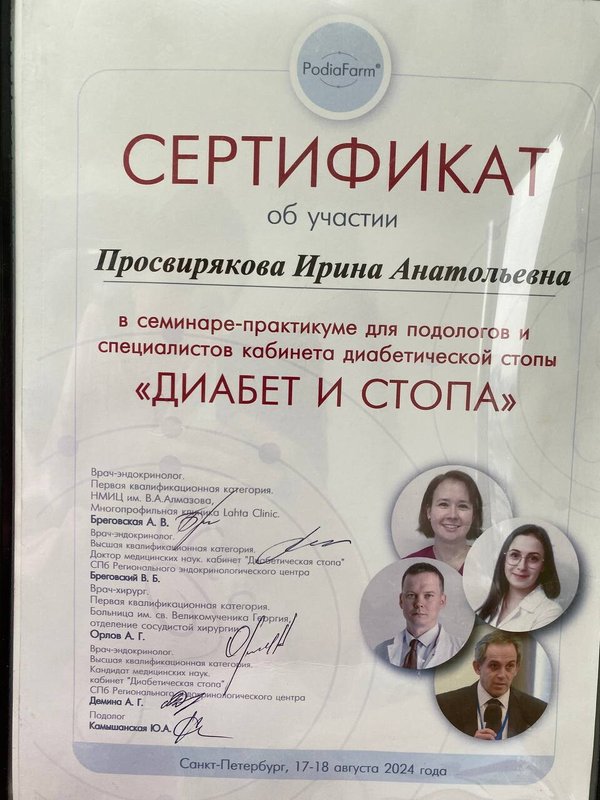 Прием, информирование об обуви, очках и других важных моментах — всё очень подробно и понятно объяснили. Обратилась с проблемой ногтевой пластины после травмы пальца, сделали процедуру, дали рекомендации по уходу: месяц смазывать раствором, затем несколько месяцев наносить крем дважды в день. Доктор Ирина Анатольевна Просвирякова — вежливая, доброжелательная, прием прошел комфортно и профессионально.